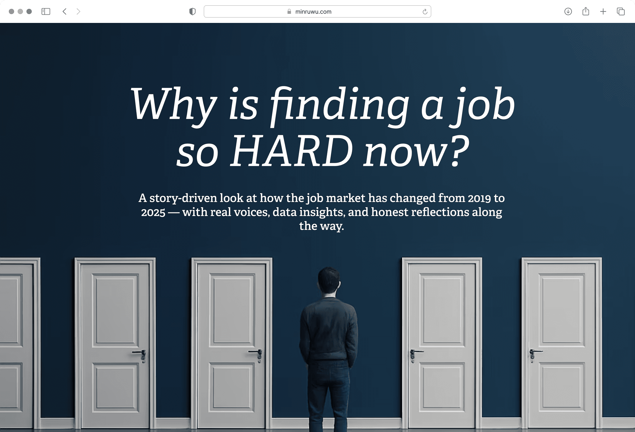 This project explores the challenges young people face in today’s job market. The topic was chosen in response to the growing sense among youth that finding a job has become increasingly difficult. While unemployment rates appear stable post-pandemic, the reality for many youth — particularly those just entering the workforce — is very different. The goal here is to use a data storytelling approach to illustrate this gap between perception and experience, with an accessible, visually engaging format.